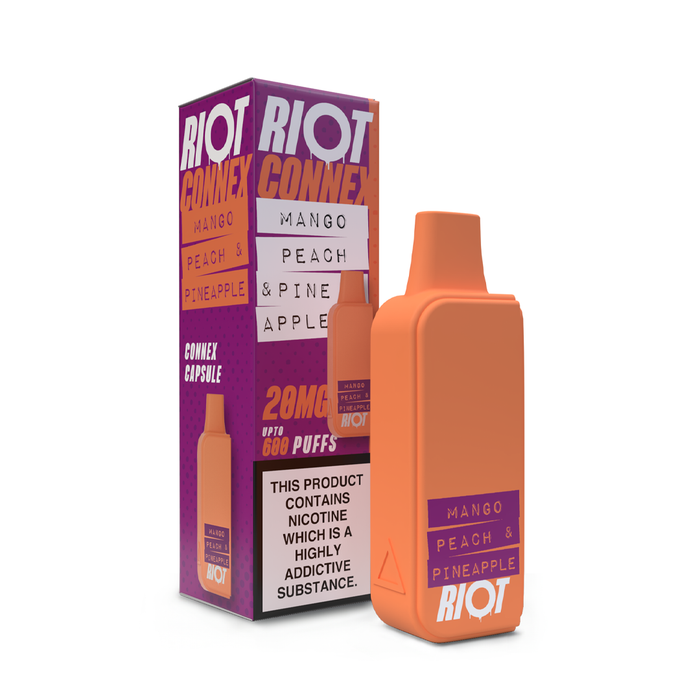 Experience the bold sweet flavour of Mango Peach & Pineapple with Riot Connex pods. Made for use with the Riot Connex pod vape kit, each pod contains 2ml of bold premium flavour vape juice, delivering up to 600 puffs.