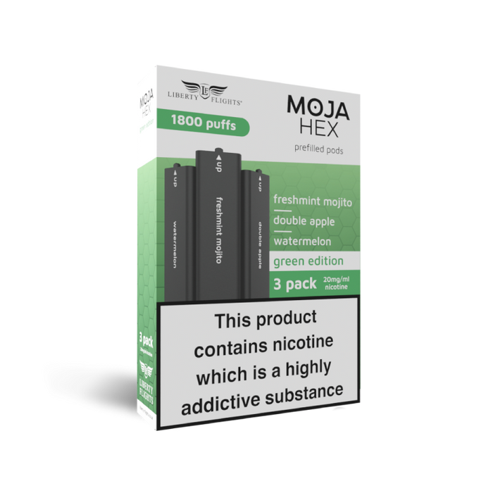 Get fresh and fruity with this pack of replacement pre-filled pods for your MOJA Hex pod kit. This Green Edition pack contains three pods in the following flavours: