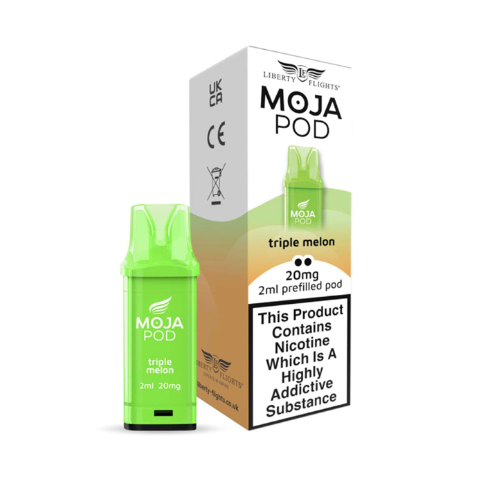 Our Triple Melon MOJA Pods are a nicotine salt based e-liquid, creating a smoother vape, our Refill Pods are available in 20mg nicotine strengths.